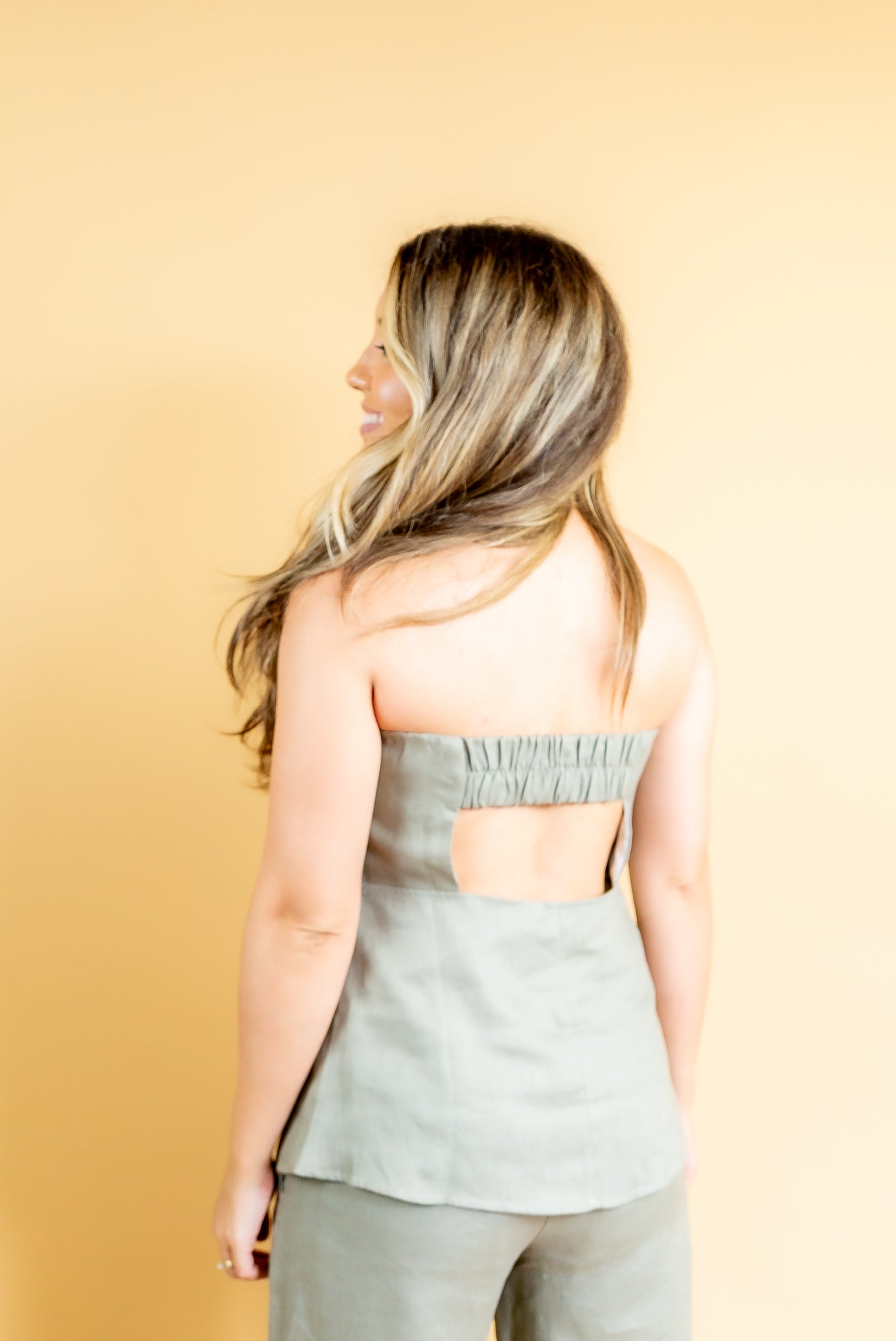 A blusa Betina possui modelagem sem alças, é toda confeccionada em tecido 100% linho, possui detalhe de elástico e decote nas costas! Possui também fechamento lateral em zíper invisível! Faz conjunto com a calça Betina, aposte!!
