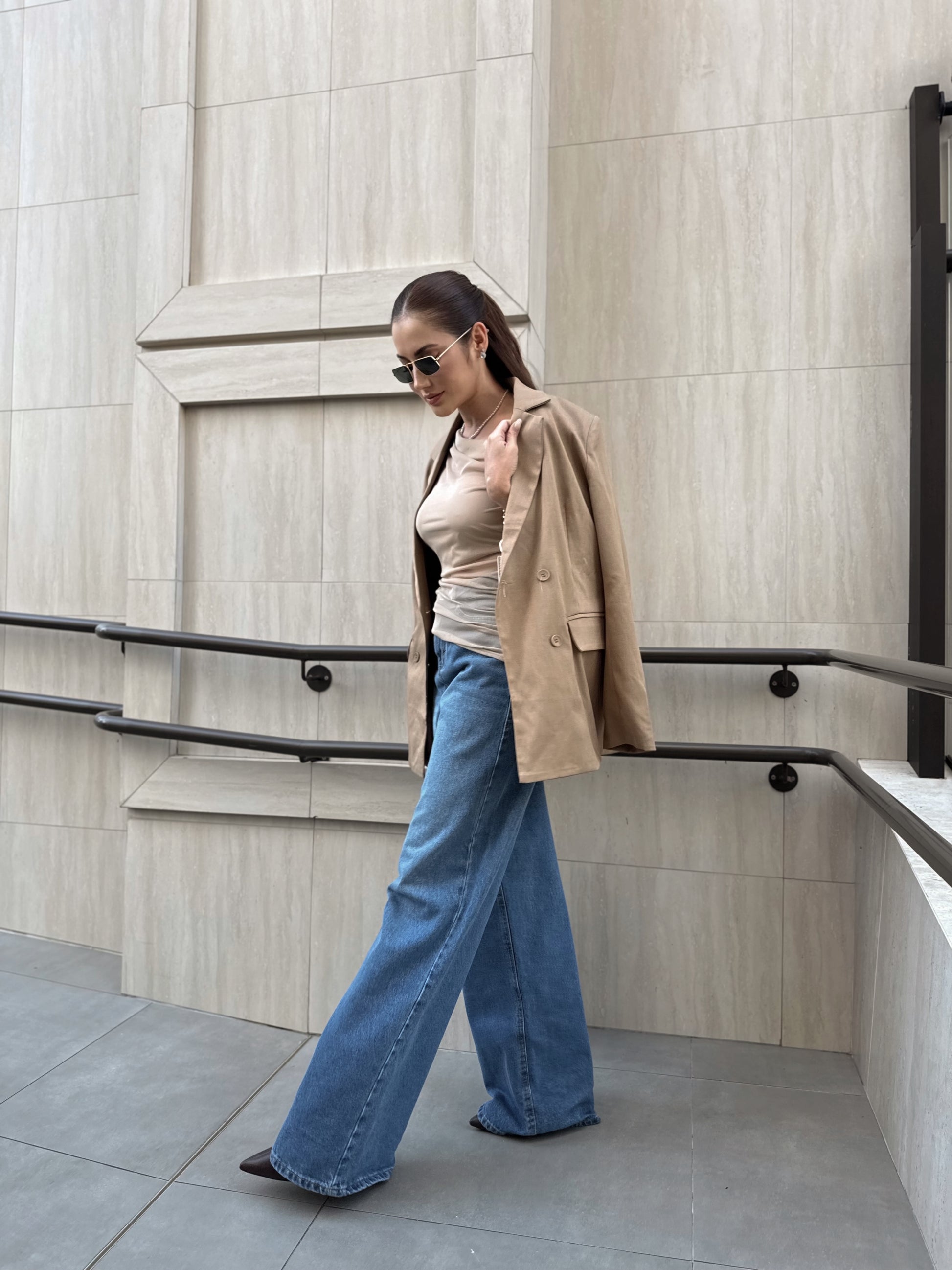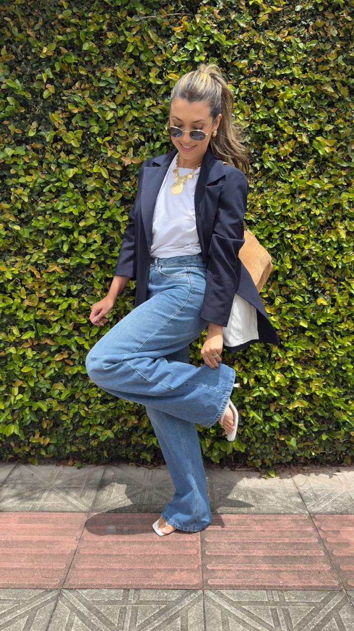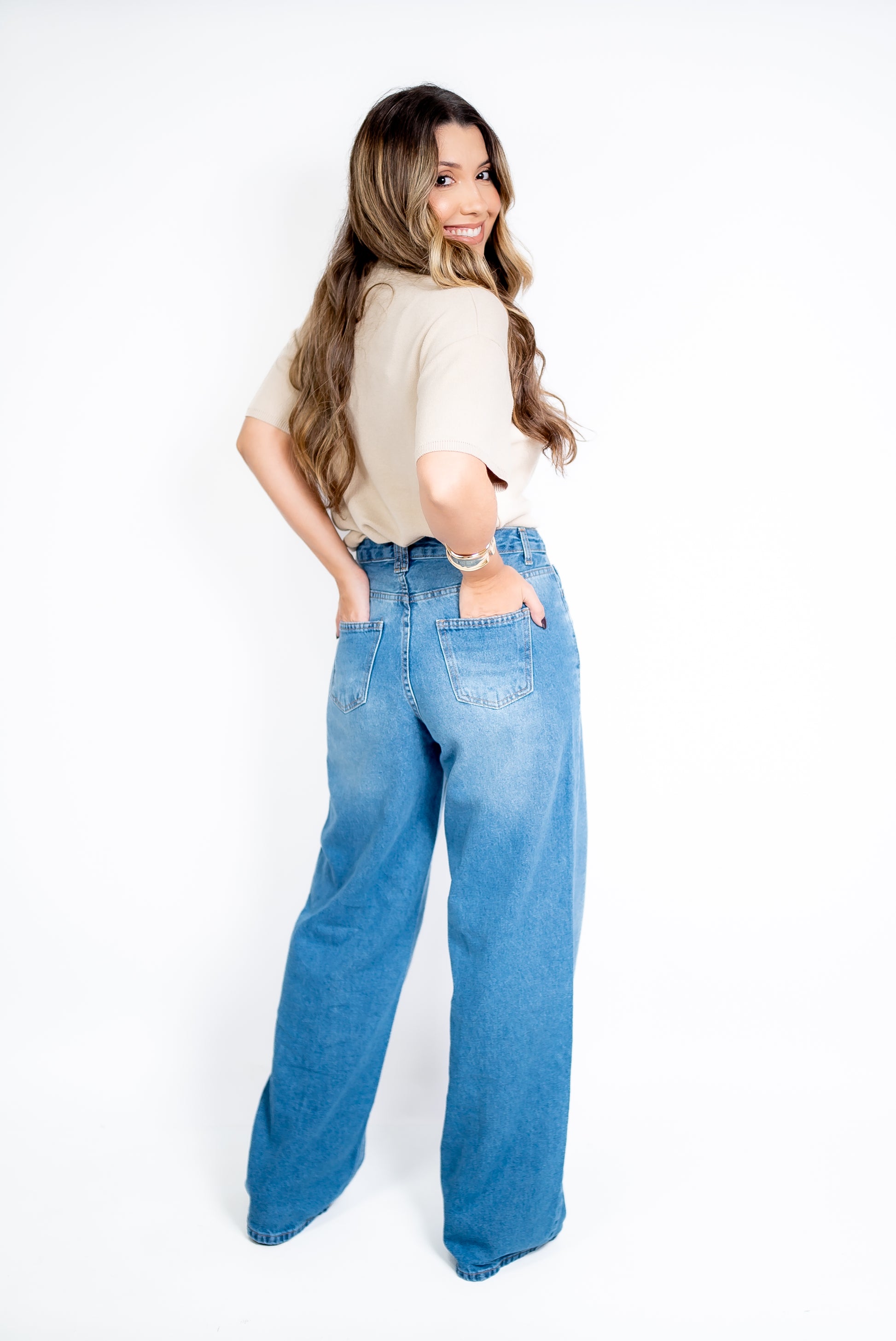 Com modelagem wide leg, cintura alta e corte reto, ela tem passantes, fechamento em botão de metal e acabamento clean que combina com tudo.