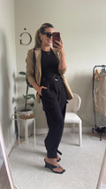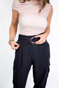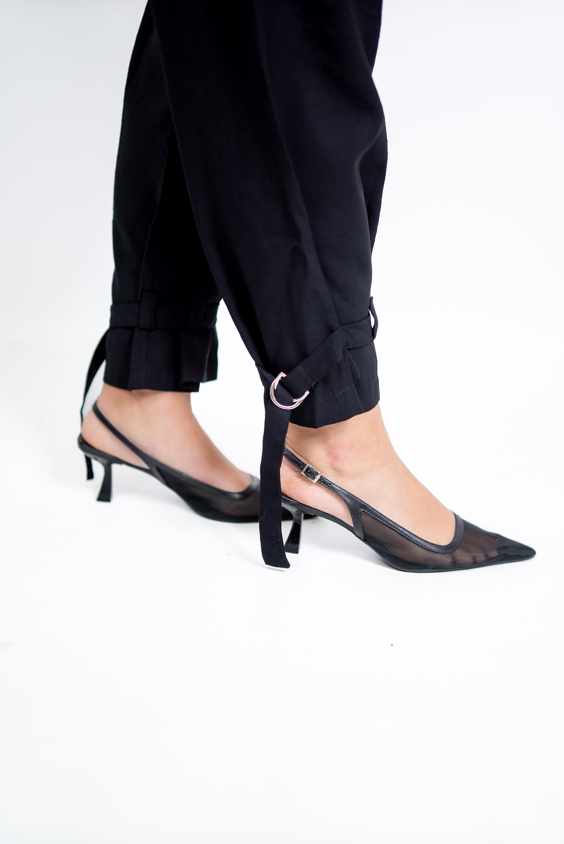 Possui cinto removível e detalhes de fivelas e amarrações no tornozelo — toque fashionista na medida certa!