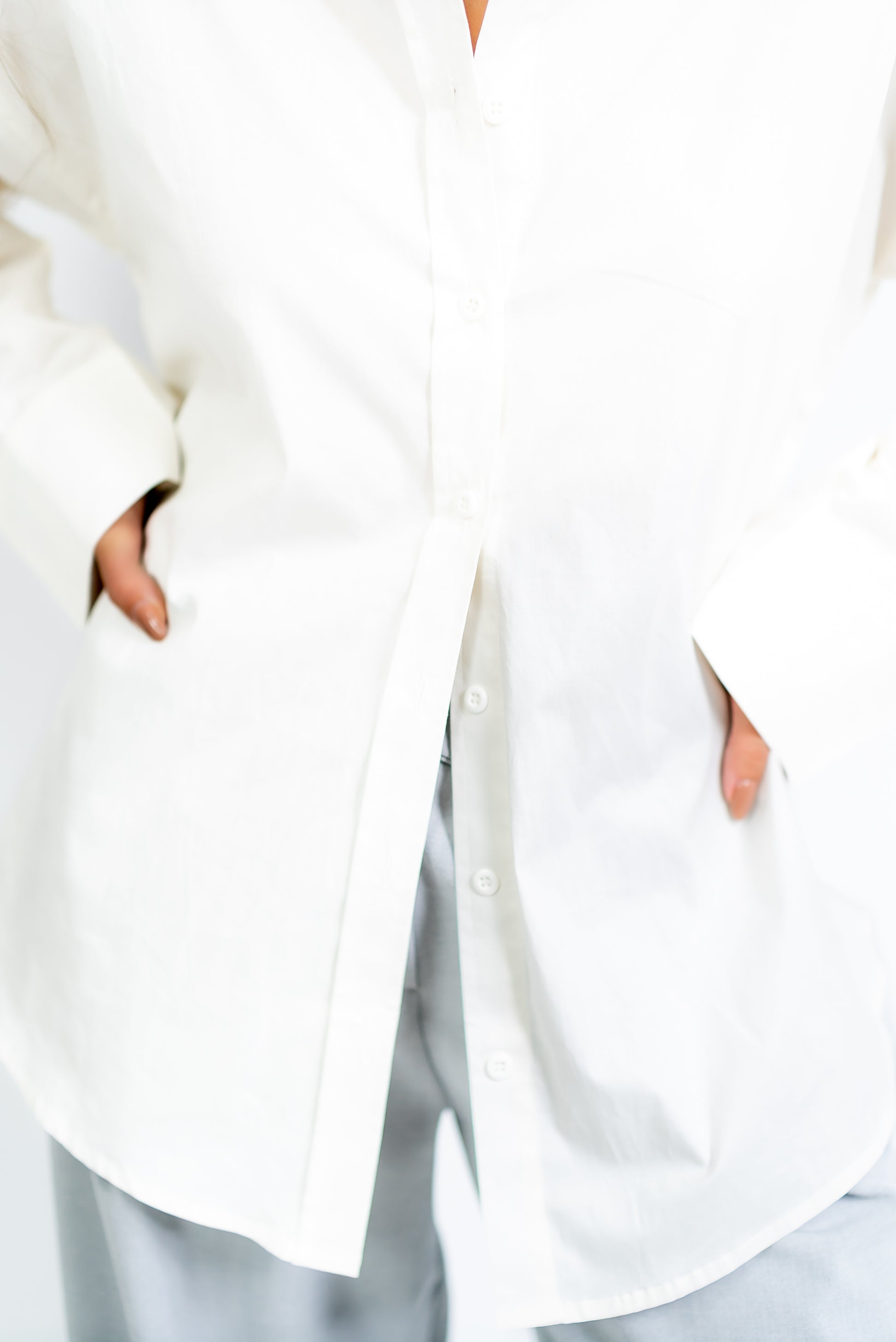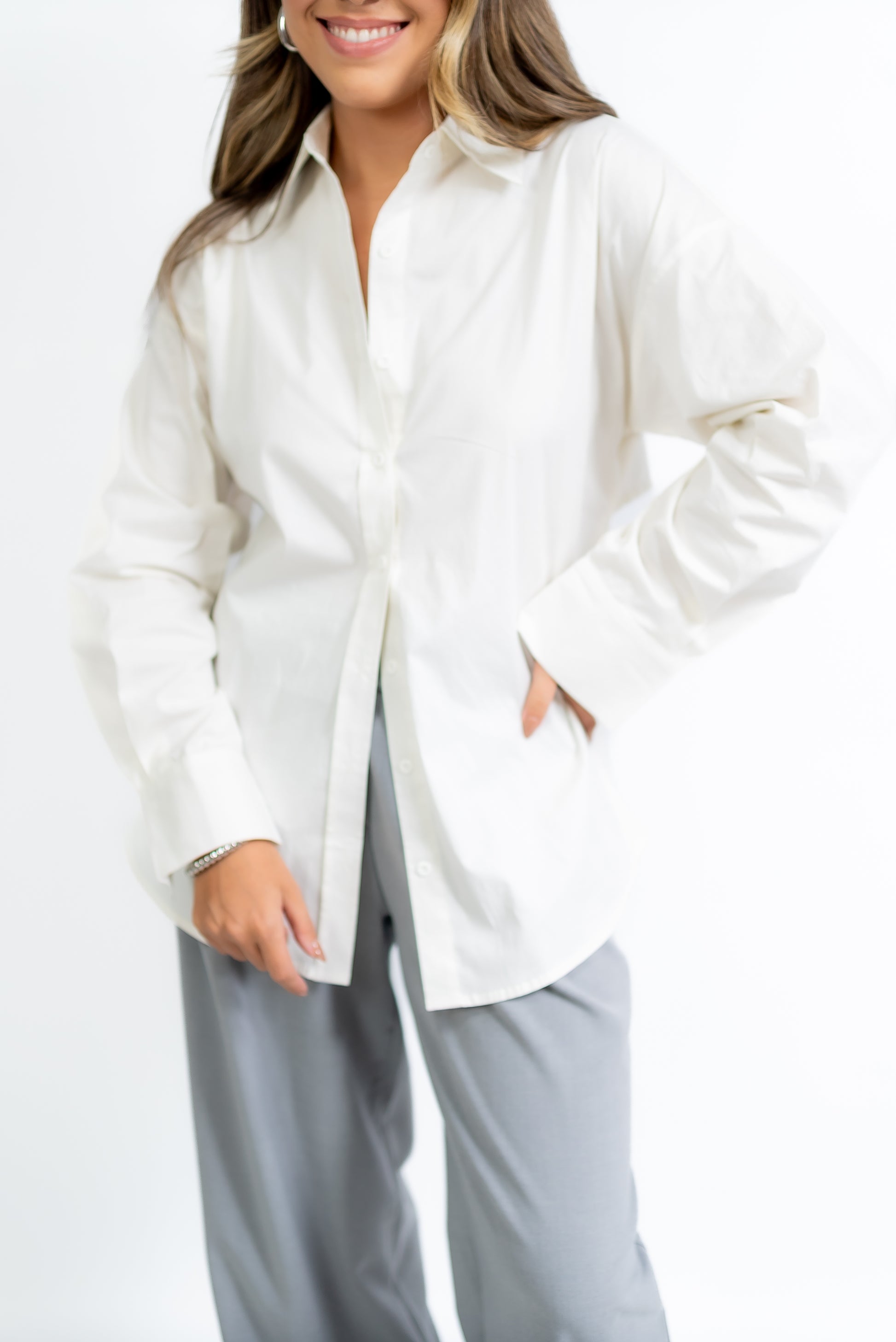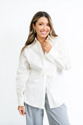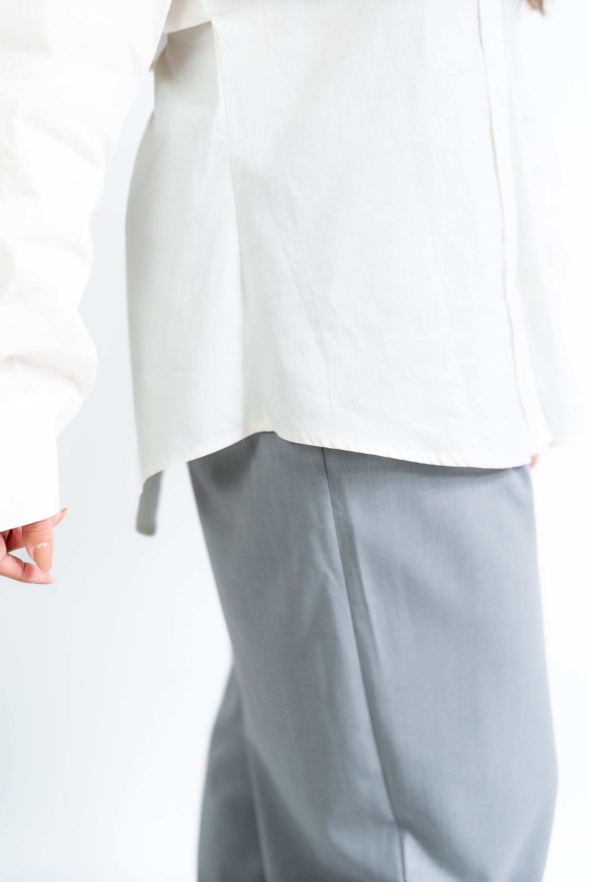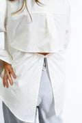 E quem disse que camisa branca de tricoline precisa ser sempre a mesma coisa? A camisa Ana possui modelagem mais over, com uma fenda na parte traseira que da lugar a um elástico. O elástico te proporciona deixar o decote nas costas mais ou menos evidente.