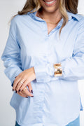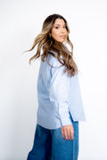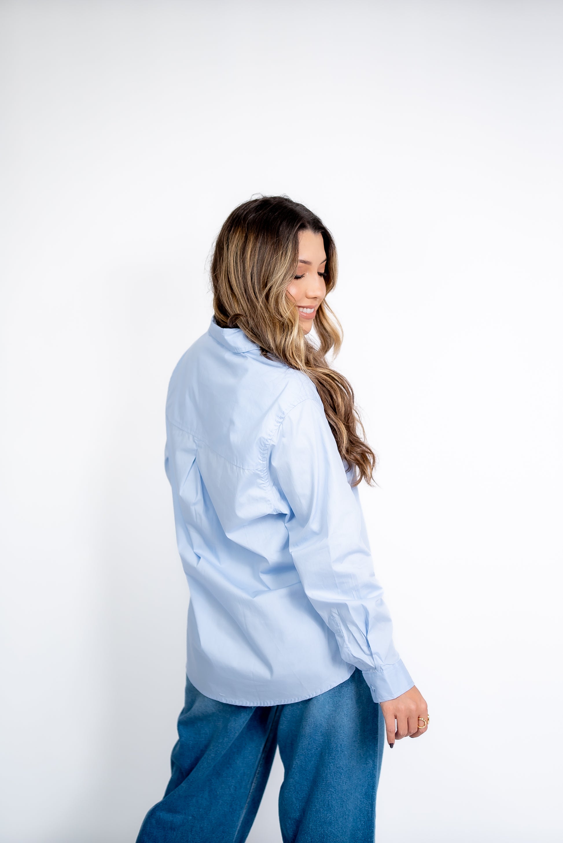 Confeccionada em tricoline azul clara — cor desejo do momento — ela tem modelagem over na medida, sem exageros, com caimento reto e elegante.
