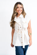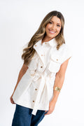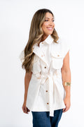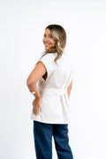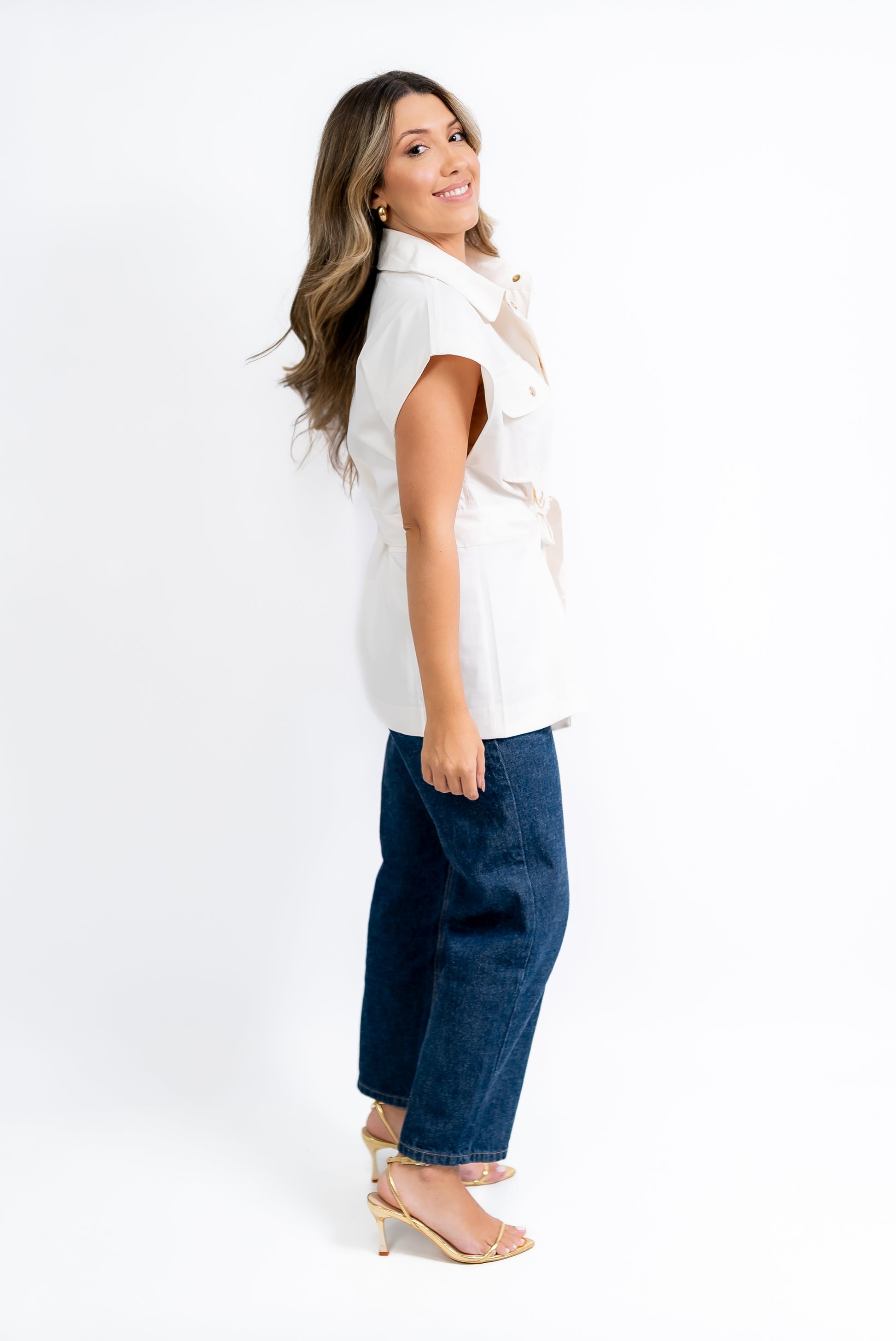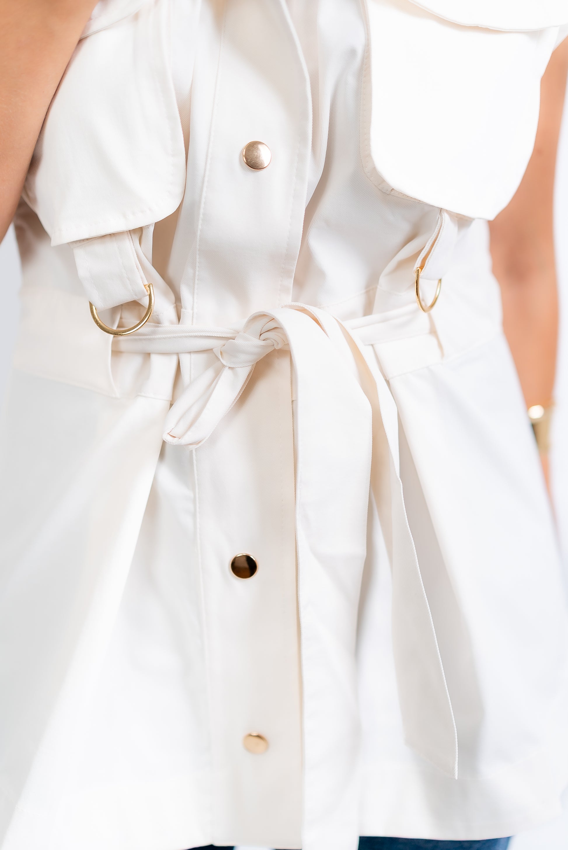 Esse colete é um mix de modernidade e versatilidade. Possui modelagem bem over, detalhes em ferragem dourada e uma faixa fixa para amarração, caso você queira deixar a peça mais acinturada.
