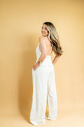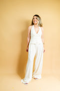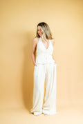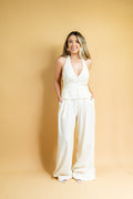 Conjunto todo confeccionado em linho misto na cor amarelo manteiga com estampa listrada! A bluasa possui modelagem frente única e detalhe com mini botões na parte da frente que dão todo um charme à peça! A calça possui modelagem reta de alfaiataria e cós com fechamento em botões! Aposte!