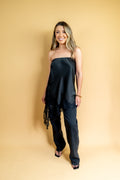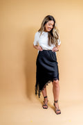 A Saia Mafe é toda confeccionada no cetim gloss, possui modelagem assimétrica, com detalhe de renda na barra e fenda na lateral! Possui elástico no cós, o que possibilita usar a peça de duas formas: como saia e como blusa mais alongada também!
