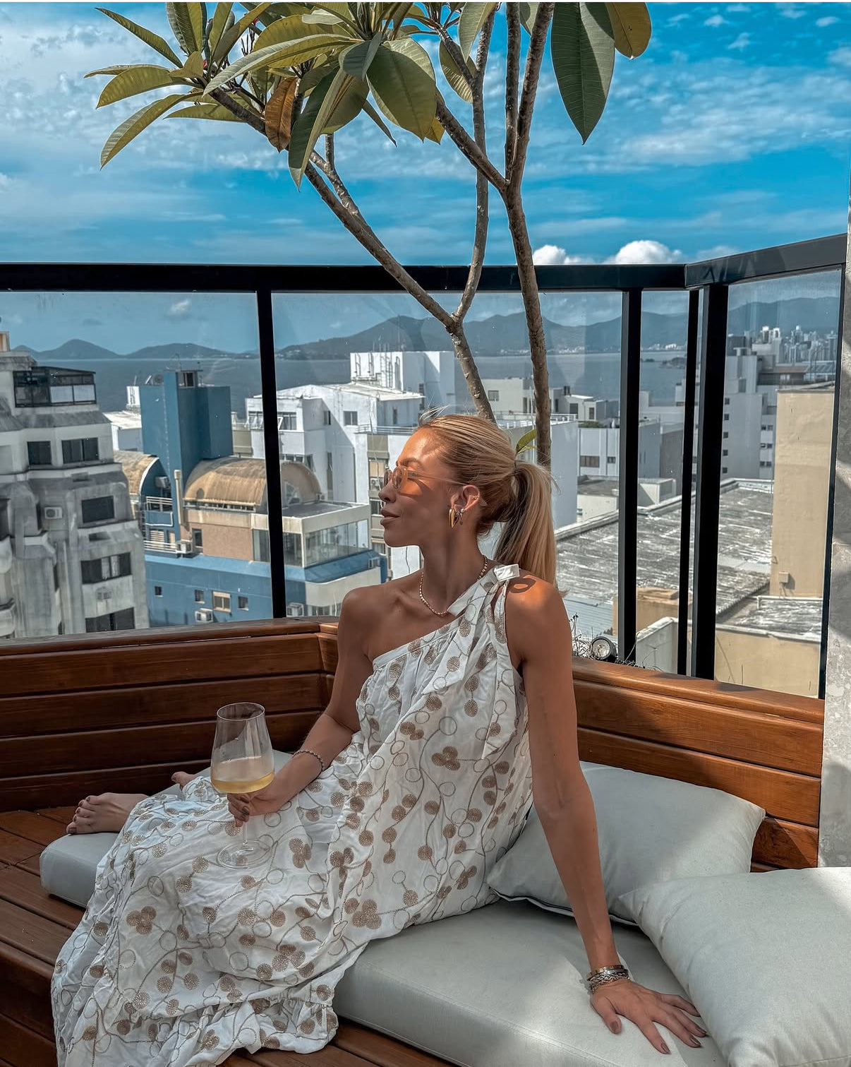 Elegante e fluido, o vestido Isa possui modelagem de um ombro só com amarração na alça e um maxi babado na barra! Ele é todo bordado com fio dourado que da um toque sofisticado de brilho para peça! Sabe aquela peça que te alonga?